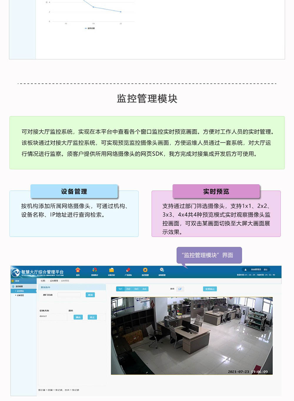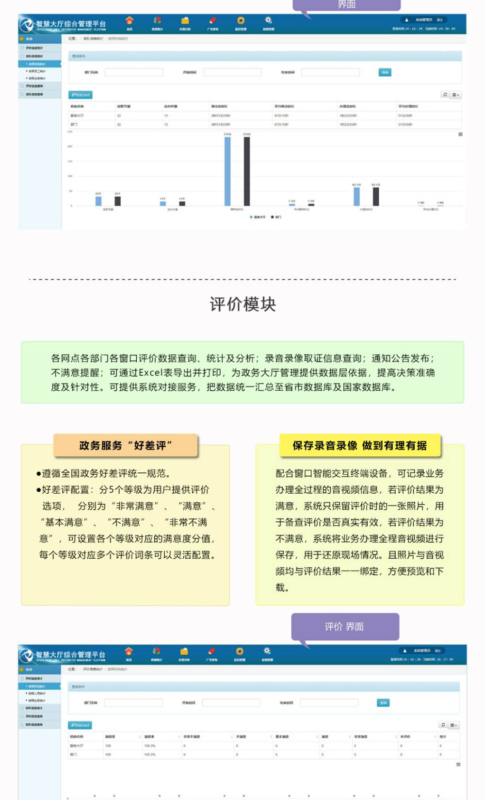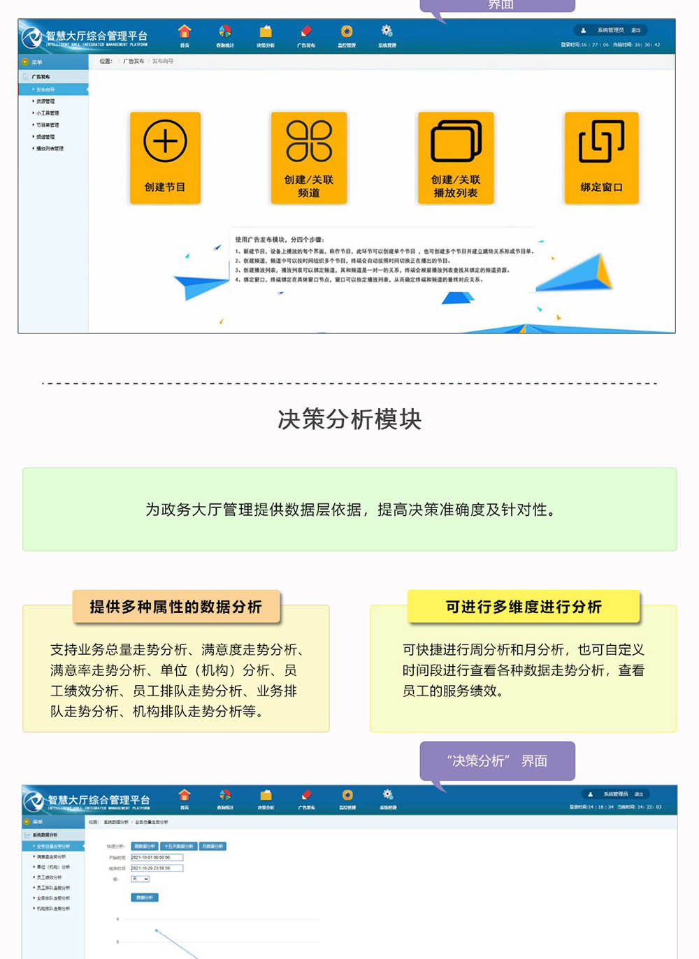 智慧大厅综合管理平台系统包含系统设置模块(人员、机构、设备管理)、排队模块(排队信息的查询统计)、智能评价交互管理模块(评价信息的查询统计)、多媒体信息发布模块(自由编辑显示界面)、决策分析模块(关键数据的走势分析)、监控管理模块(可查看网络摄像头的监控内容)等。智慧大厅综合管理平台系统采用B/S架构,无需在领导电脑安装任何软件,领导即可通过电脑浏览器IE访问,进行排队评价数据统计、分析及系统设置管理等操作。