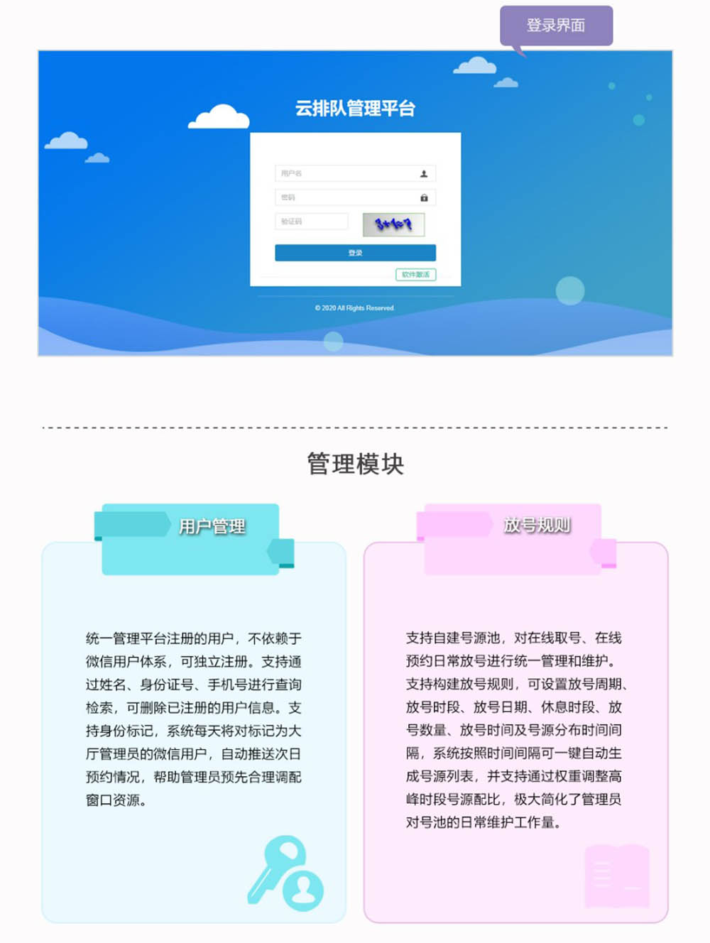 智能云预约管理平台系统包含管理模块(必选)、基础块、增值模块等。